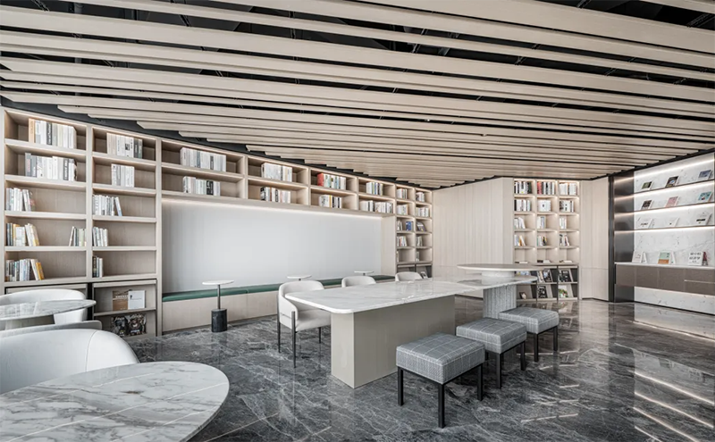 垂直空間往往是小辦公室設計中被忽視的一部分。通過增加高架儲物柜、懸掛式架子、吊柜等設計,可以釋放出更多的地面空間,使得辦公區域更加整潔有序。墻面可以被用來掛置文件、展示企業文化和藝術裝飾,既能夠提高空間利用率,也能增強辦公區域的視覺效果。